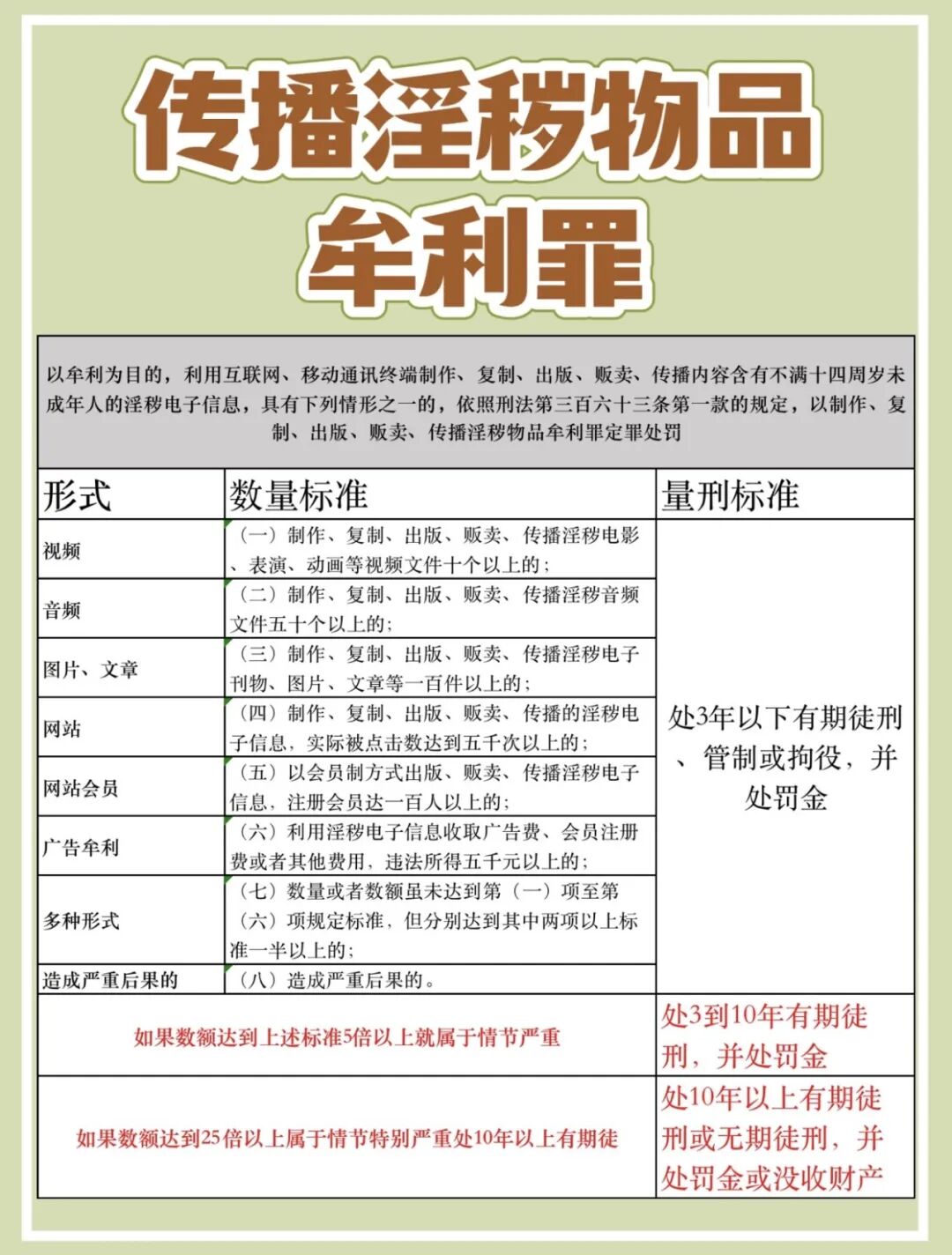 向他人传播淫秽视频达 20 个以上,或通过传播此类内容获利 1 万元以上,就已达到刑事立案标准,最低可判处 3 年以下有期徒刑;