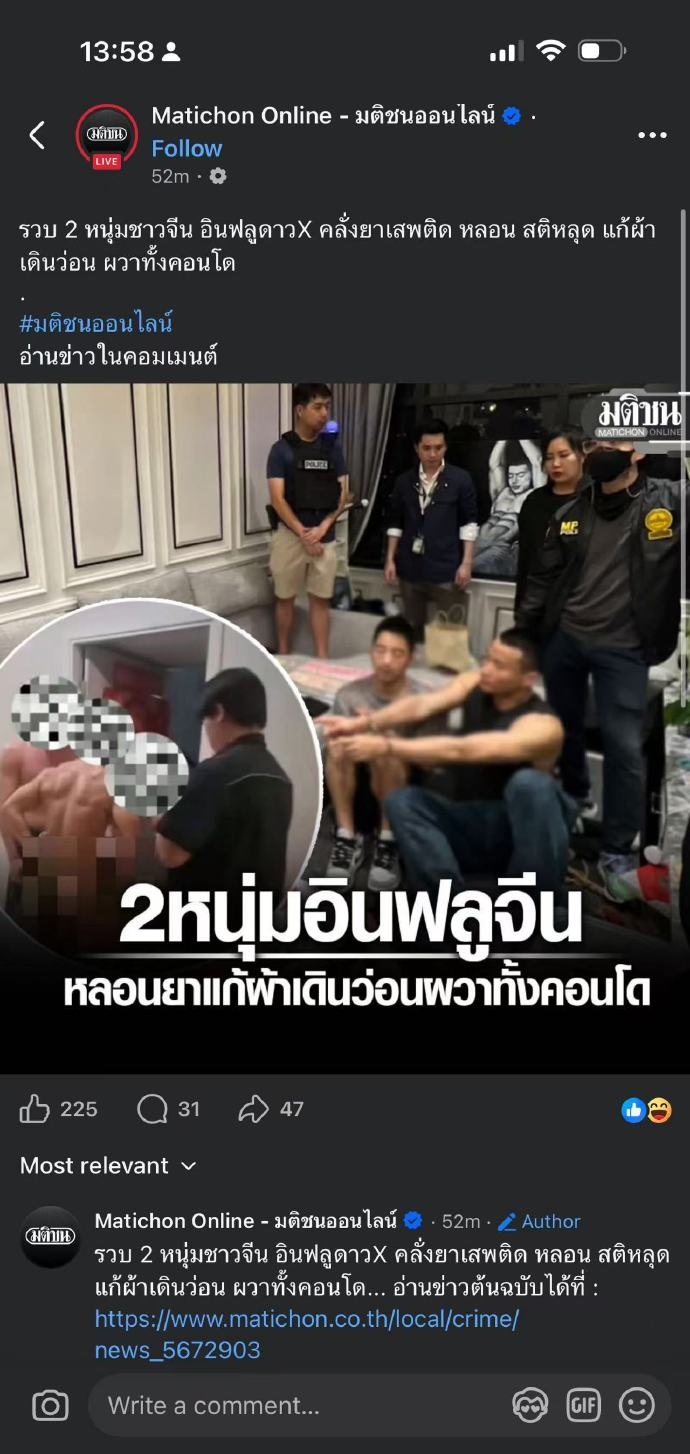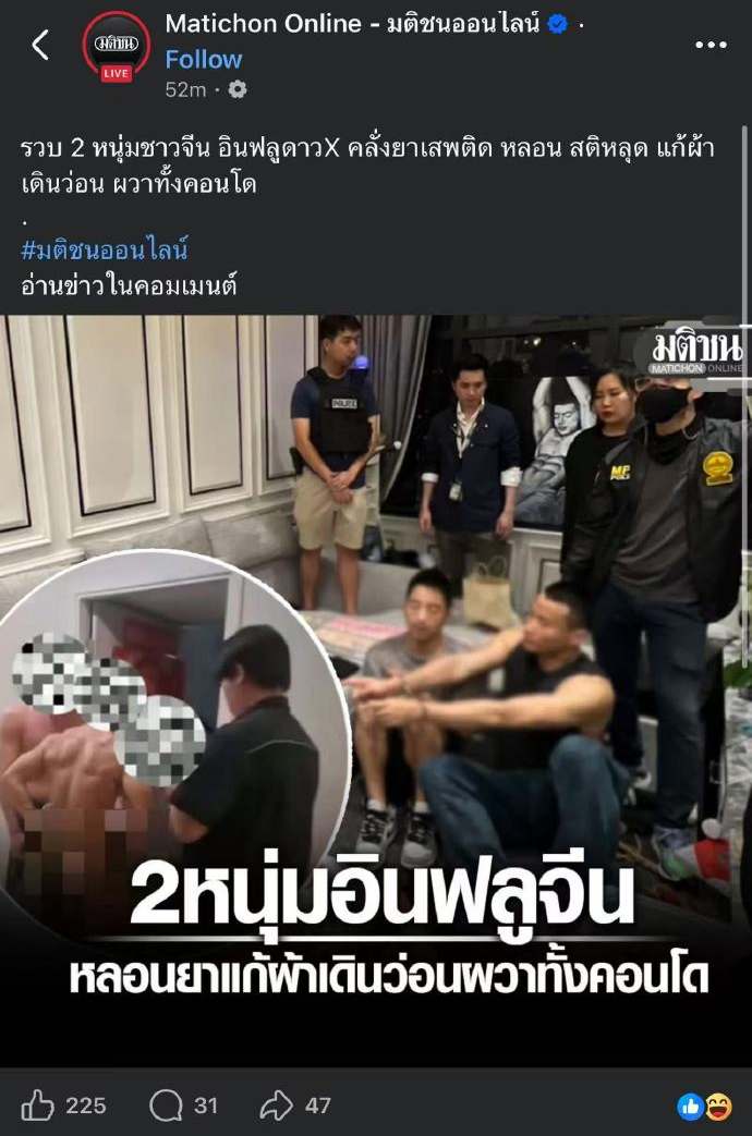 4 月 10 日凌晨,曼谷沙吞区一处高档公寓,警两名中国籍网红,因涉嫌吸毒、在公共区域裸奔、恐吓骚扰邻居,被泰国警方当场抓获。